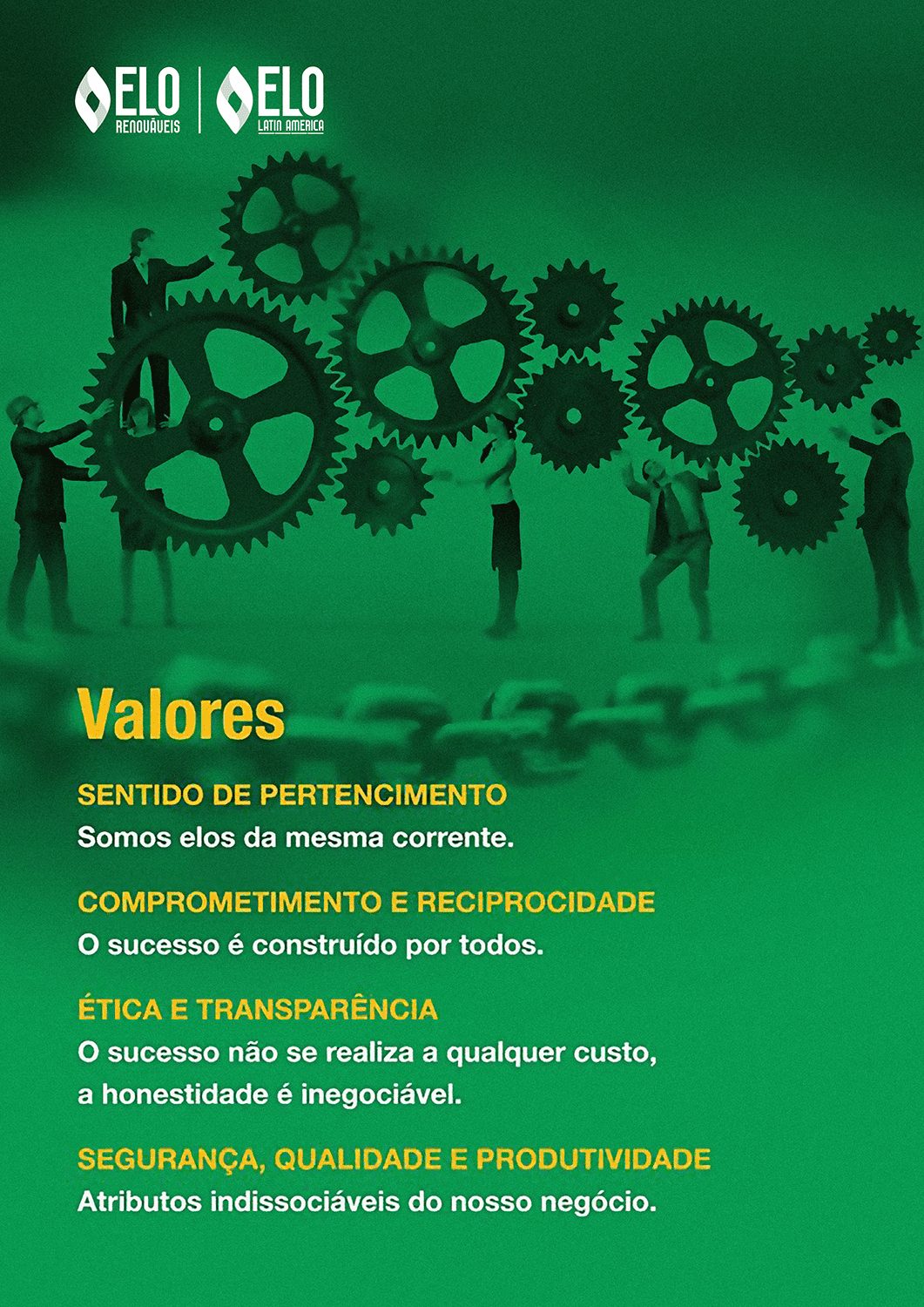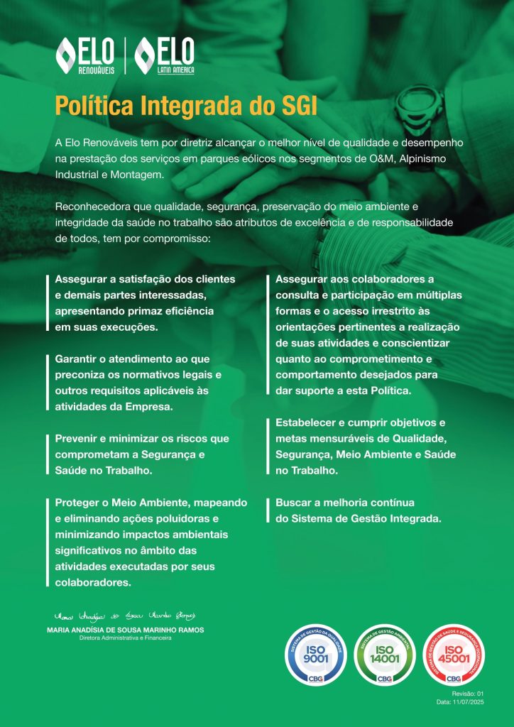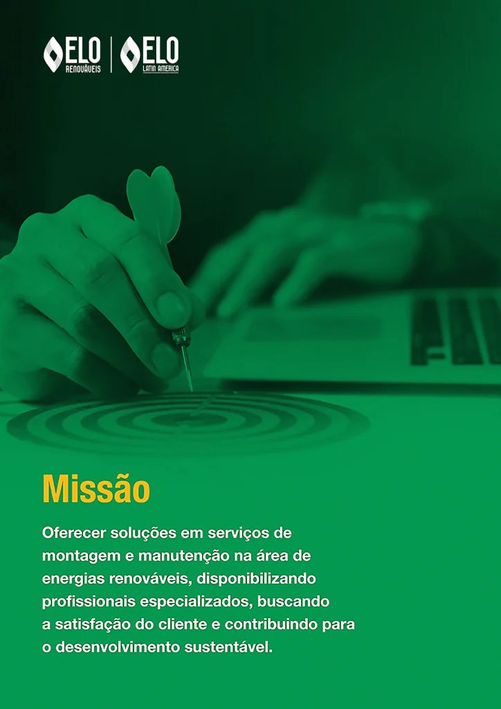 Concebida a partir da decisão empresarial de unir expertises profissionais diversas para o aprimoramento da prestação de serviços especializados, a Elo Renováveis tem como seu escopo a montagem e manutenção em parques eólicos, atuando sempre com um olhar inovador na percepção do cliente enquanto um organismo vivo e diferenciado, oferecendo para cada uma das necessidades, soluções integradas que contribuam para a expansão e o desenvolvimento sustentável dos negócios.